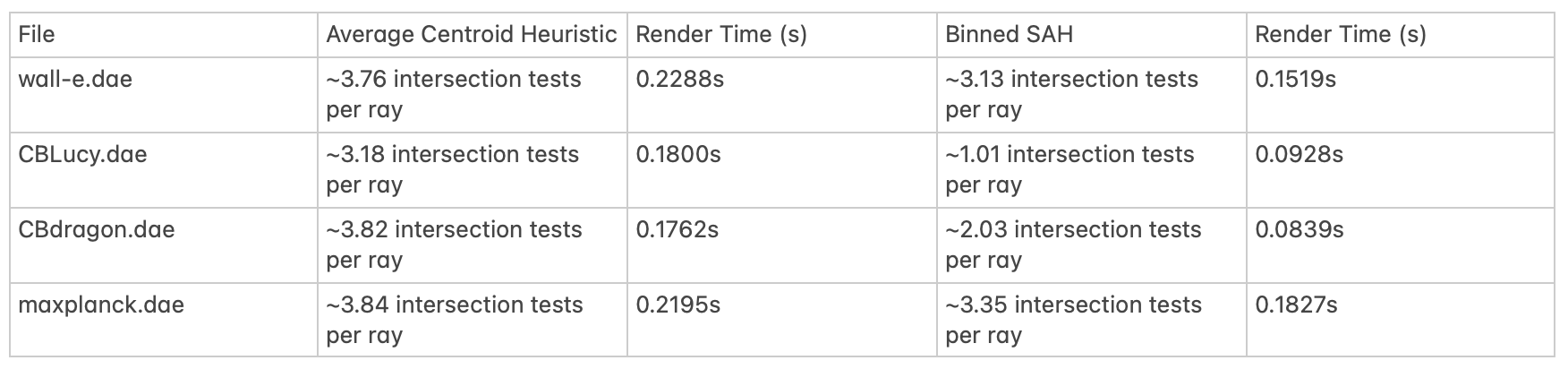With this new heuristic we made marginal improvements to rendering speed, but were still able to reduce the number of intersection tests per ray. This reduction is more significant for files where there is a more uneven distribution of primitives (i.e. odd geometry, more protrusions, etc...) like CBLucy.dae where there is more to be gained from making smart partitions as we can reduce the amount of empty space included in the bounding boxes of nodes, letting us ignore nodes which we would have otherwise had to explore if we used a worse heuristic (i.e. Nodes we need to check in situations where the ray intersects the bounding box, but still misses all of the primitives contained within).