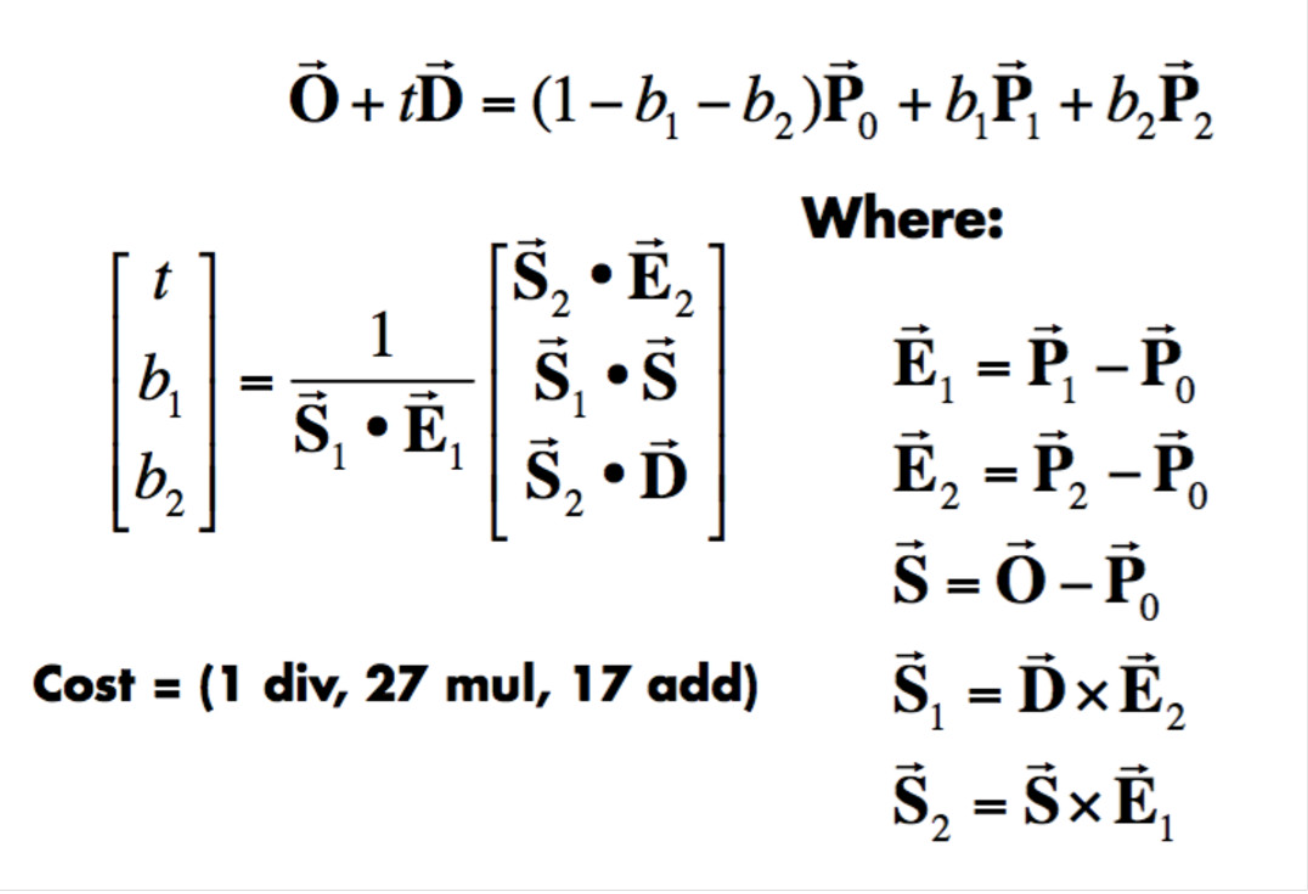 This allows us to express the plane intersection point of a ray as a set of barycentric coordinates for the triangle